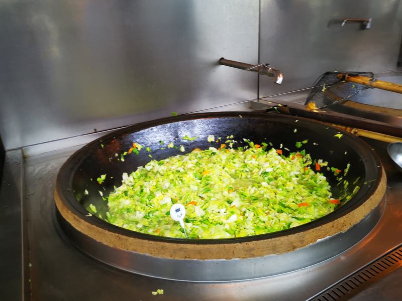 在人大附小食堂的后厨,厨师们正在为师生们准备午餐。菜炒熟后,厨师在大锅中间插入一个温度计测试菜品温度,只有炒菜的中心温度达到70摄氏度以上才能出锅,保证菜烧熟煮透。每个菜出锅后,都要进行食品留样。